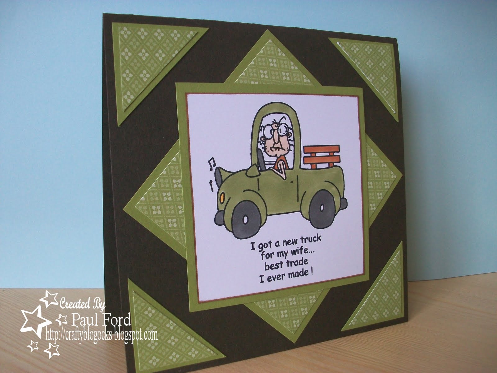 Here's my take on it. I've used a Bugaboo Gus image and sentiment with an Old Olive (SU) and Brown colour combo which is a fave of mine: